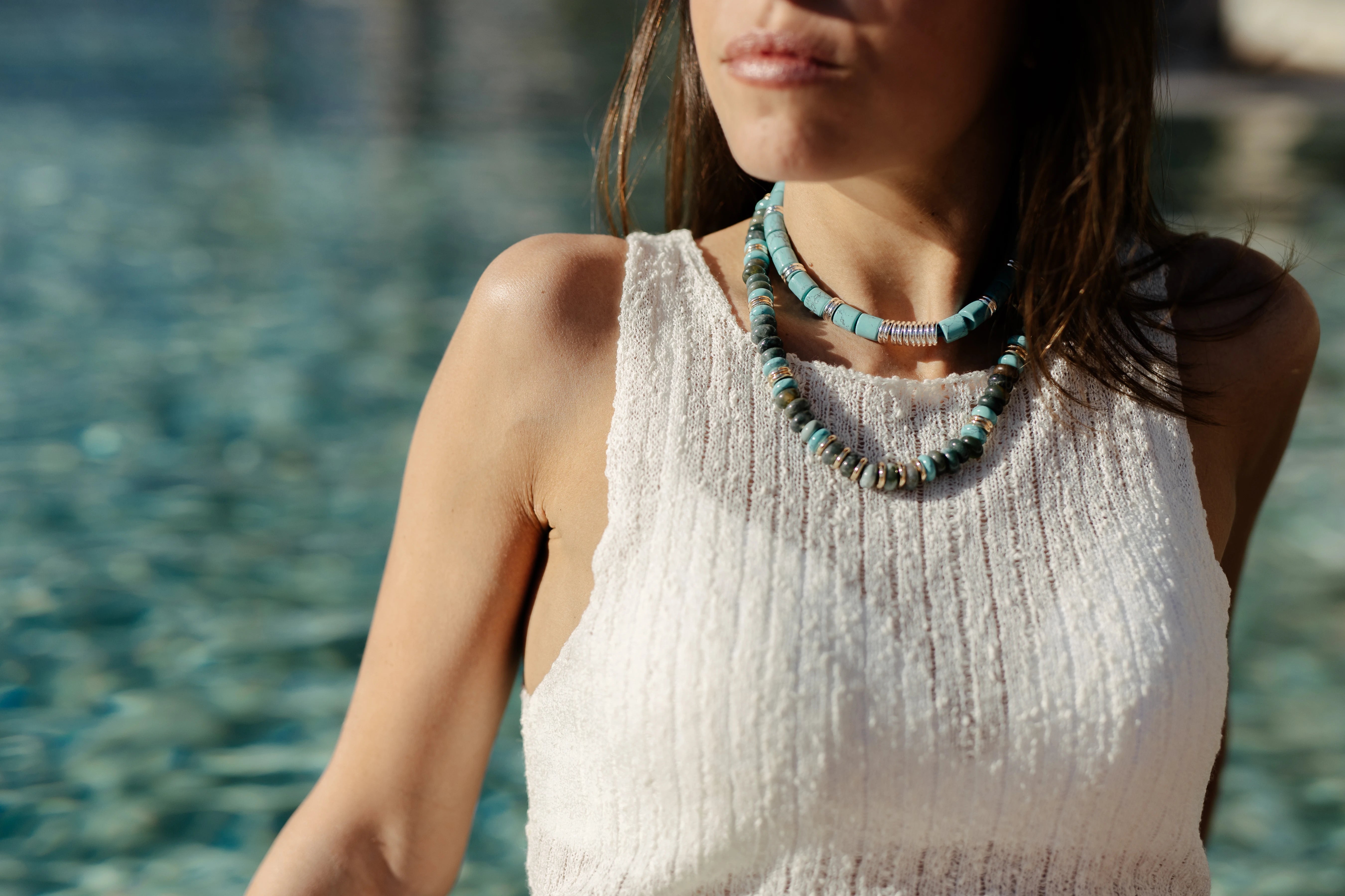 - Pearls: Gold plated (3 microns) and silver sometimes interfere to punctuate and highlight the brilliance of this succession of colored stones.